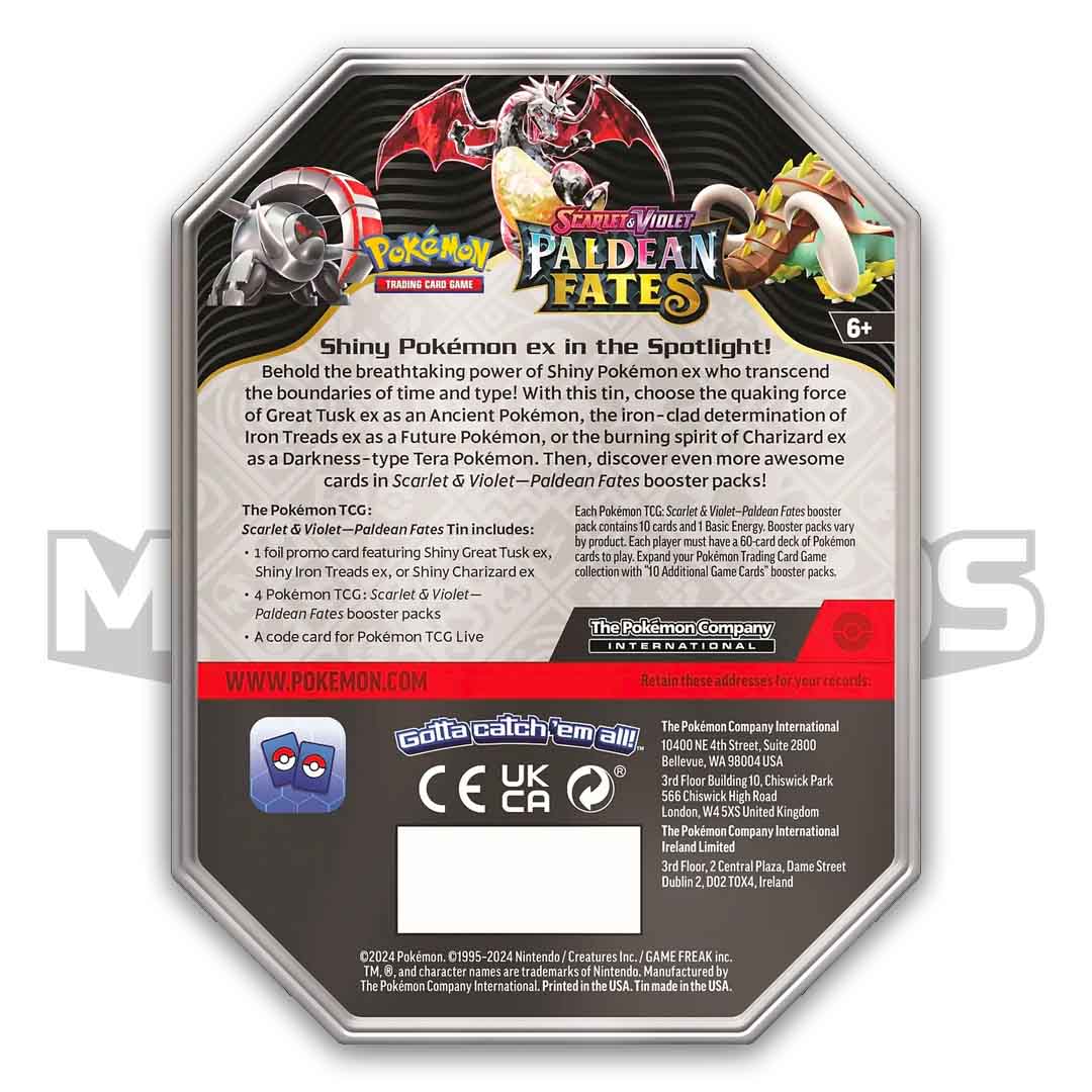 Behold the breathtaking power of Shiny Pokémon ex who transcend the boundaries of time and type! With this tin, choose the quaking force of Great Tusk ex as an Ancient Pokémon, the iron-clad determination of Iron Treads ex as a Future Pokémon, or the burning spirit of Charizard ex as a Darkness-type Tera Pokémon. Then, discover even more awesome cards in Scarlet & Violet-Paldean Fates booster packs!