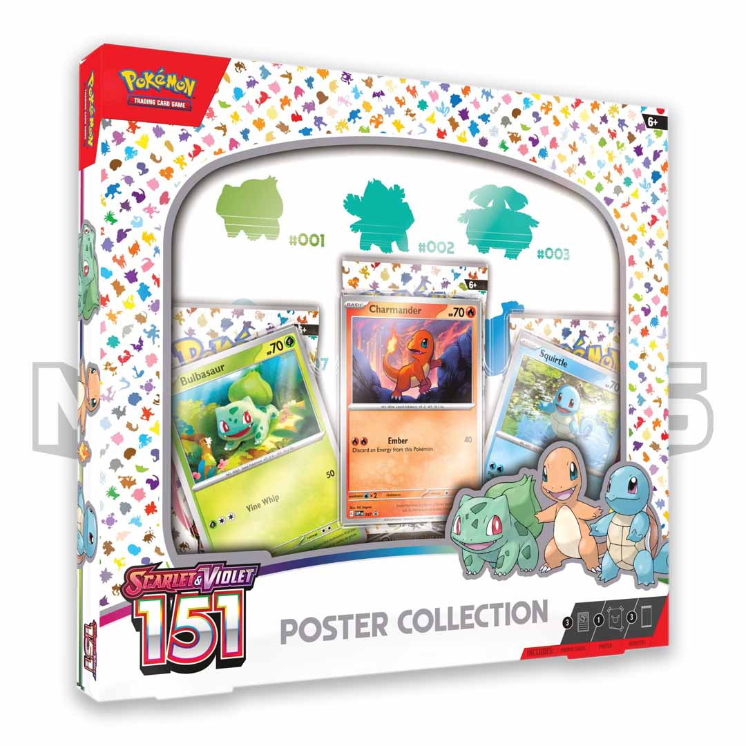 An epic journey through the Kanto region wouldn’t be complete without a first partner Pokémon! Add Bulbasaur, Charmander, and Squirtle to your team as playable foil promo cards, then work on completing your Kanto Pokédex by opening more booster packs from the special Scarlet & Violet—151 expansion. On top of it all, you’ll find a colourful poster that’s ready to hang wherever you like!