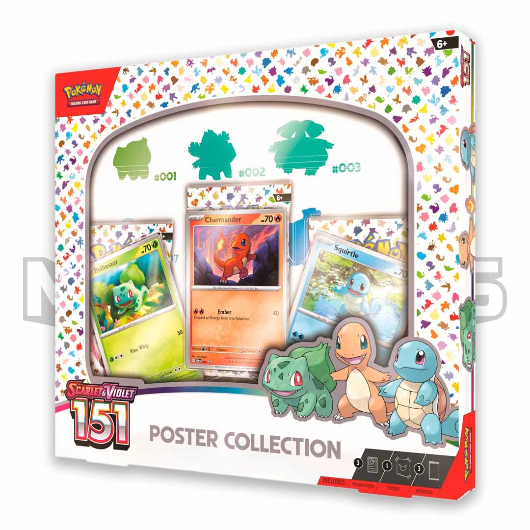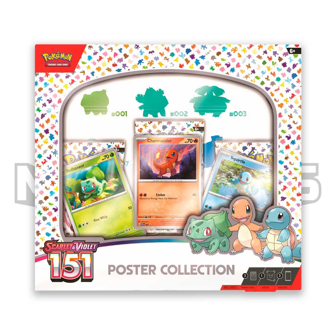 Includes three Scarlet & Violet—151 booster packs, three promo cards featuring Kanto first partner Pokémon and one full-size, two-sided poster featuring the original 151 Pokémon as well as the card illustrations of each Pokémon in the expansion